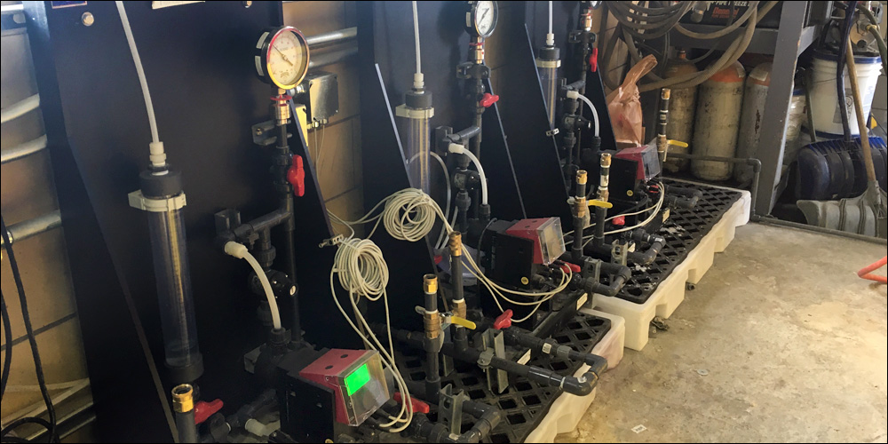 1. Chlorine Leak Detector. The leak detector senses chlorine gas in the air of the chlorine storage and chlorinator room. Chlorine can be harmful in concentrations that cannot be smelled; the detector will sound an alarm if these small concentrations are detected. Make sure the leak detector is always operating.