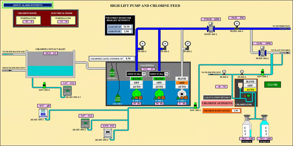 Gas chlorine is injected into filtered water prior to entering the contact basins. The intention of chlorine addition is to provide disinfection of the water with respect to log removal/ inactivation for Giardia and viruses. There are two chlorine application scenarios for the plant. The first is direct filtration which will occur if the contact adsorption clarifier (CAC) process is not on-line and the second is the normal operation with both CAC and filtration steps. Feed requirements for gas chlorine are expected to range from 20-75 lb/day.