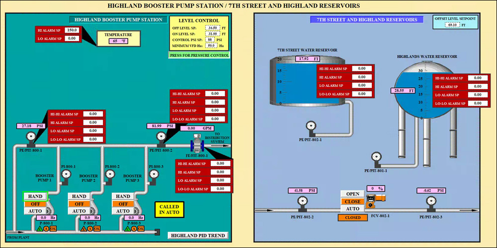 The Highland Booster Pump Station pumps water from the lower pressure zone of the City to the higher elevation northeast area, which includes the Highland Reservoir. The pumps supply the reservoir and upper pressure zone of the City, providing adequate system pressure at all times.