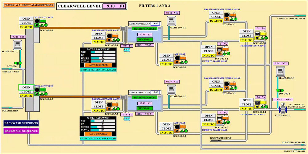 Filters are backwashed automatically based on several parameters, or backwash can be initiated manually. Upon backwash, the inlet weir gate slowly closes, and the FE valve remains open, draining the filter water level down to the top of the BWW wash troughs. The FTW valve will then open as the FE valve closes and continue to lower water level down to approximately 6 to 12-inches above the media level. The FTW valve then closes, and the air and water backwash sequence begins. After backwash, BWS water is used to fill the filter to the operating water level and then closes. The inlet weir gate opens allowing TW into the filter and the FTW valve opens, modulating to maintain the water level. The FTW process proceeds, until the filter is ready to be put back on-line, indicated by reaching an operator set turbidity value and maintaining that value for an operator adjustable time. The FTW valve then closes, and the FE valve opens, beginning the filtration cycle.