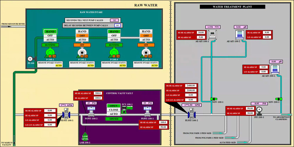 The raw water sample station at the WTP is used for evaluating raw water quality including turbidity and pH. Both instruments are connected to the PCS for monitoring and trending.